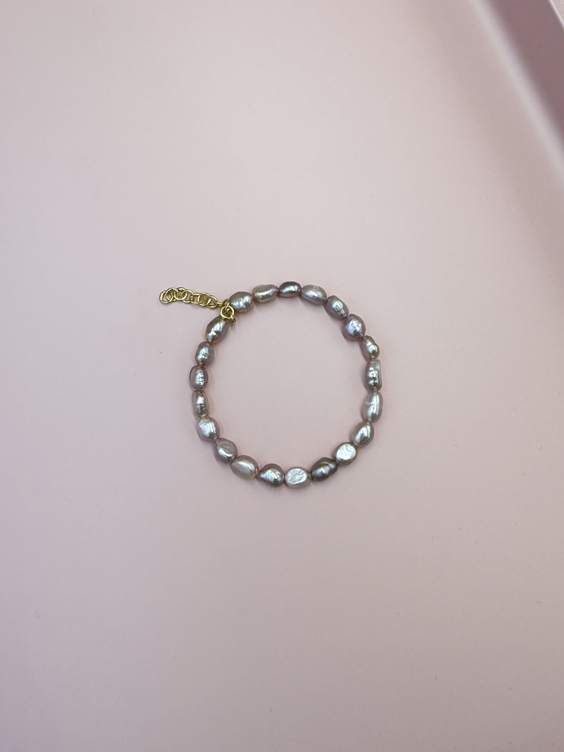 Subtelna bransoletka z różowych pereł, które delikatnie połyskują w świetle, tworząc elegancki i kobiecy akcent.