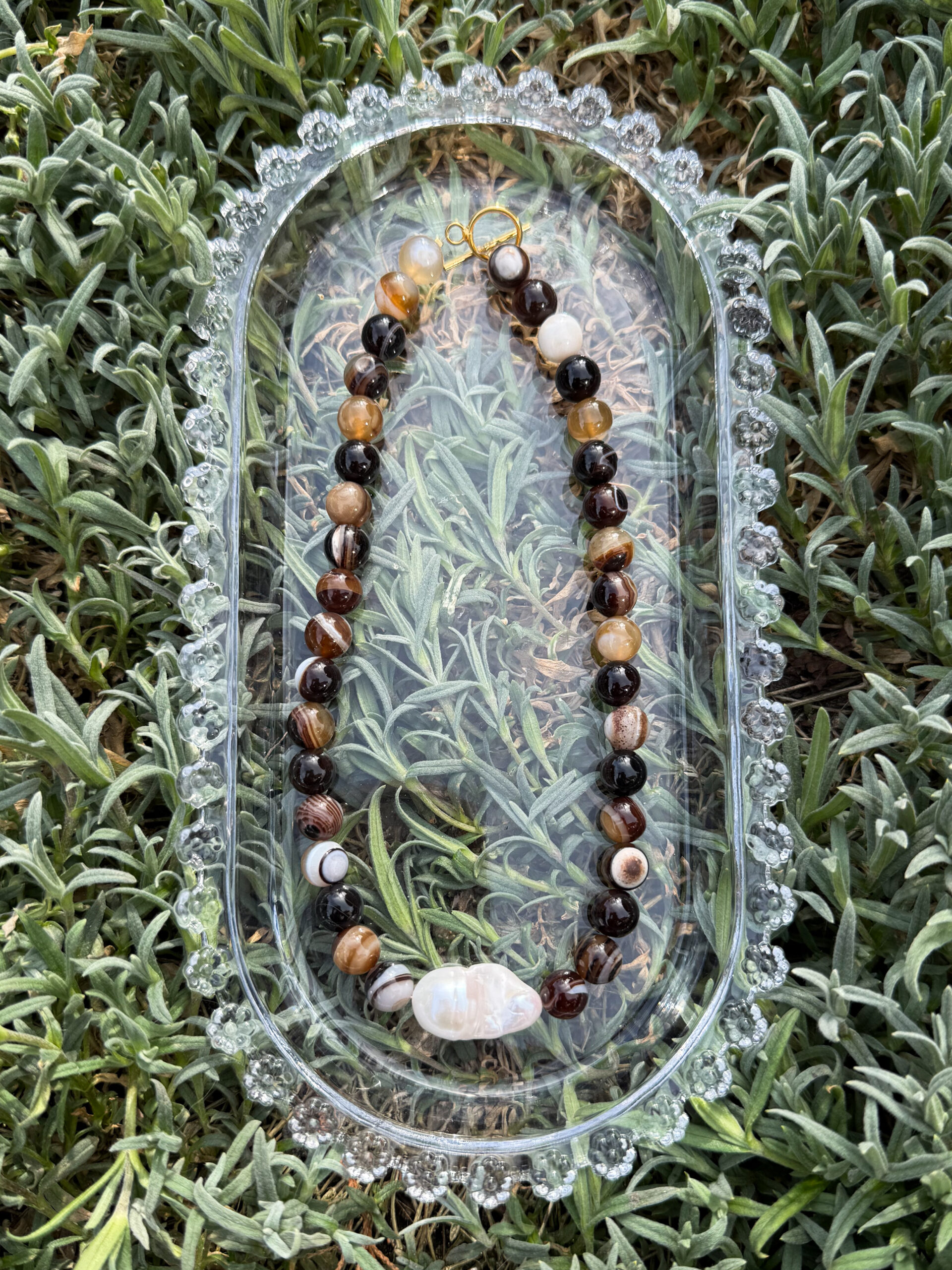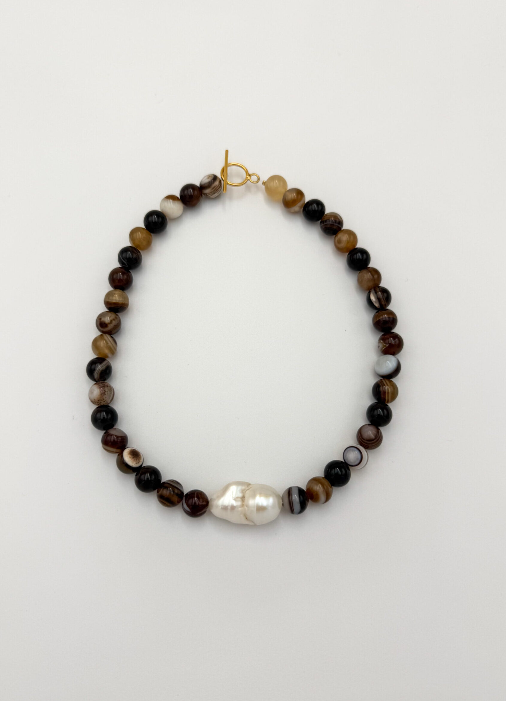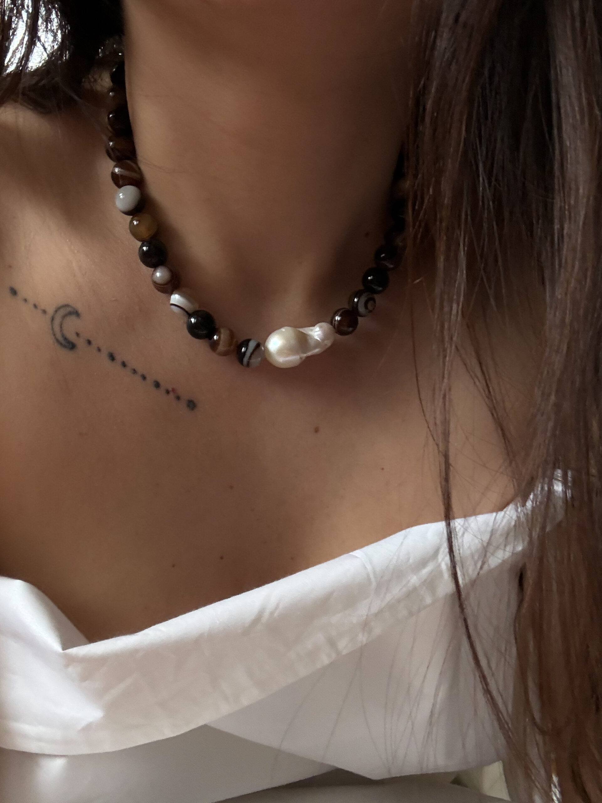 Naszyjnik choker z barokową perłą i brązowym agatem to ręcznie wykonana biżuteria, która łączy naturalne piękno pereł z ciepłym odcieniem kamienia półszlachetnego. Każdy egzemplarz powstaje ręcznie, dzięki czemu naszyjnik ma unikatowy charakter i wyjątkową formę.