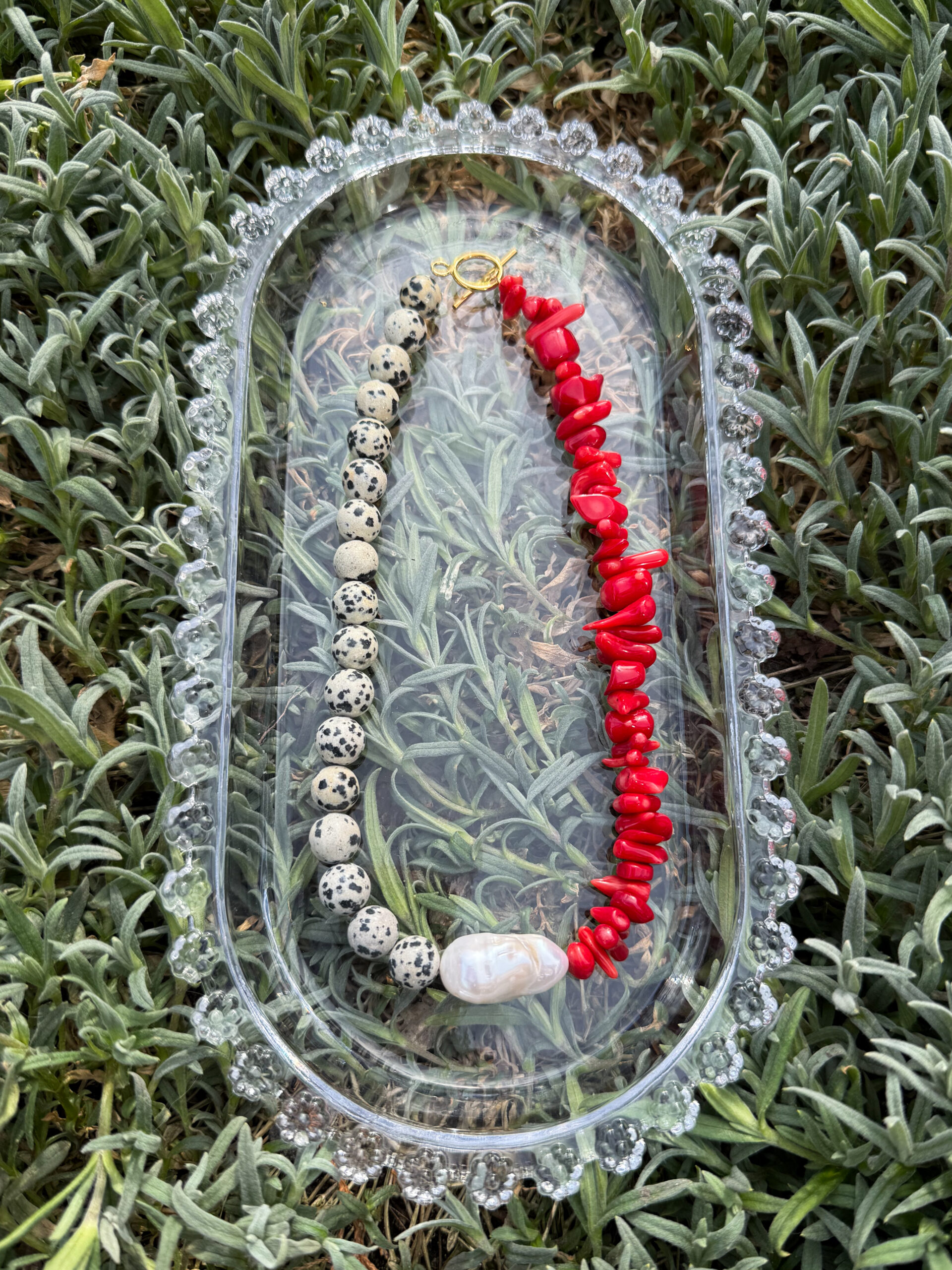 Ten naszyjnik z barokową perłą, jaspisem dalmatyńskim i koralem będzie wyjątkowym dodatkiem do stylizacji oraz oryginalnym prezentem dla miłośników naturalnej, artystycznej biżuterii.