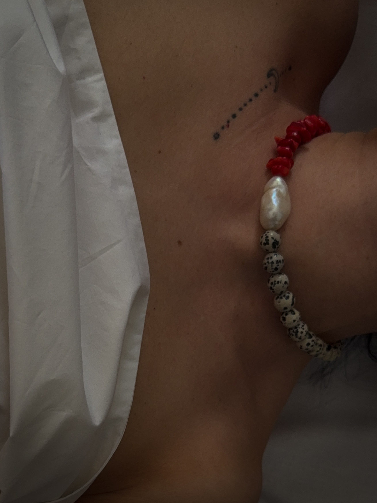 Projekt wyróżnia się asymetrycznym zestawieniem kamieni. Z jednej strony perłę uzupełnia jaspis dalmatyński, znany ze swojego charakterystycznego, nakrapianego wzoru. Z drugiej strony znajduje się sieczka z naturalnego koralu, która dodaje kompozycji ciepłego koloru, charakteru i energii.