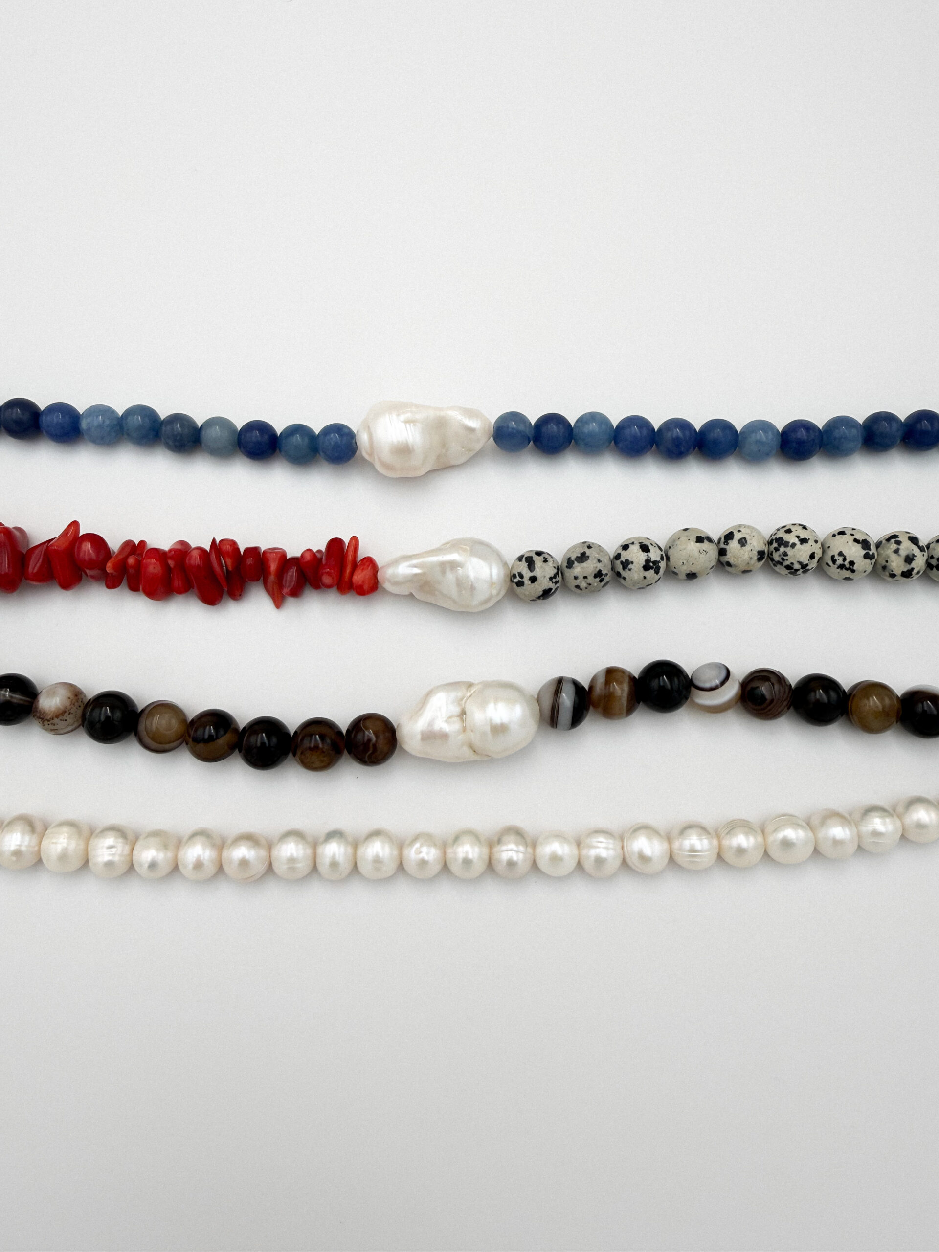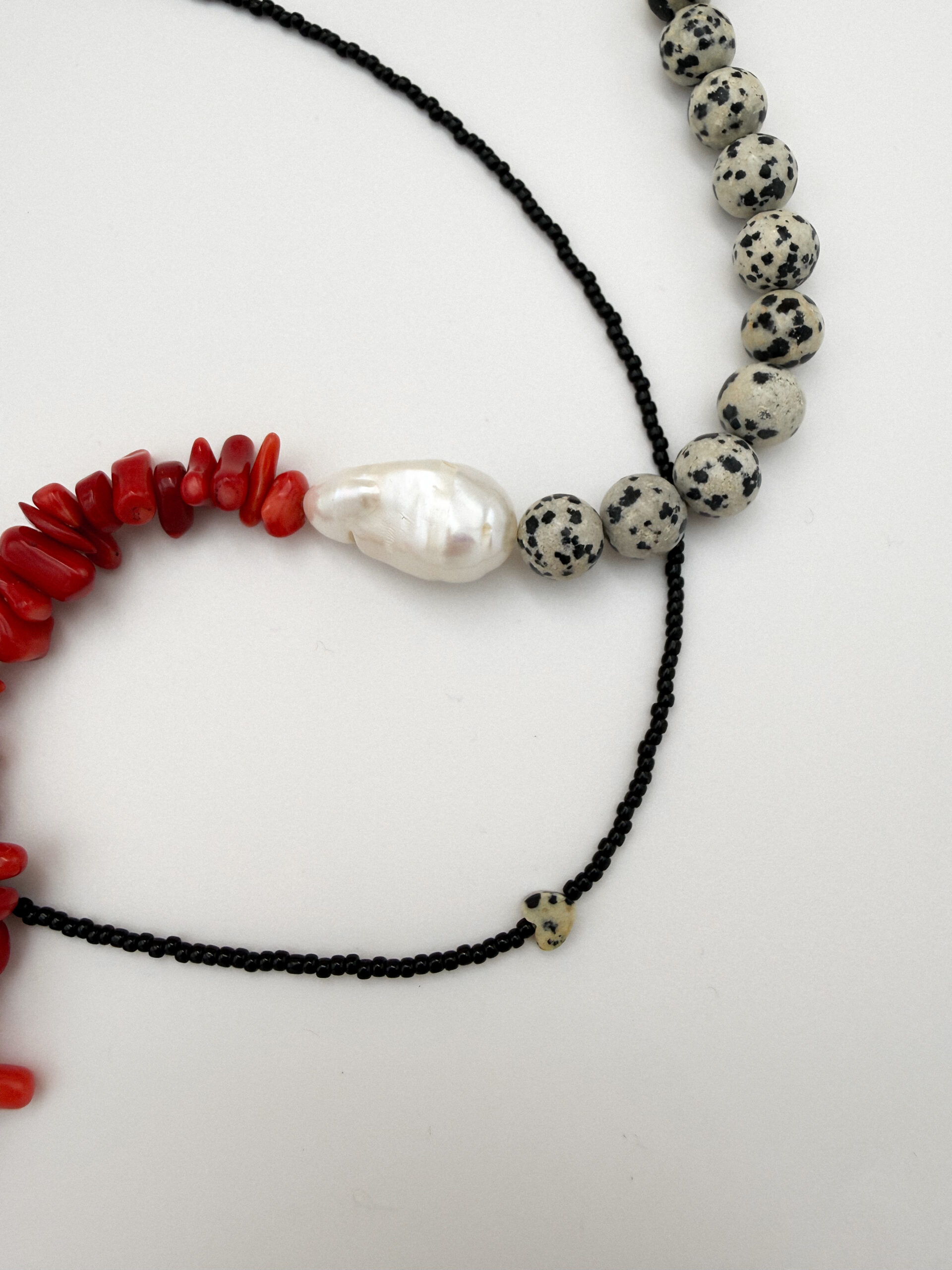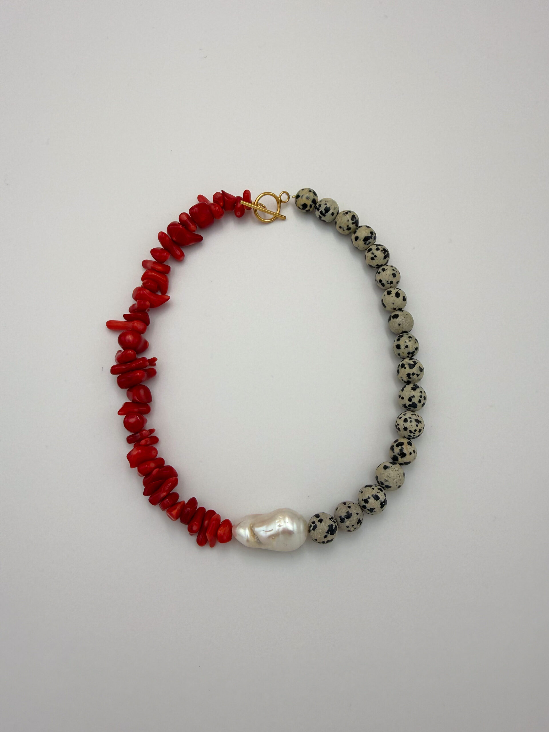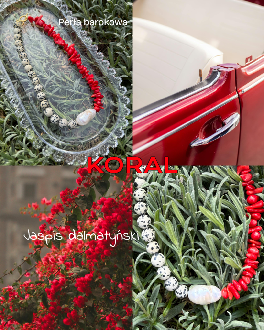 Naszyjnik choker z barokową perłą, jaspisem dalmatyńskim i koralem to ręcznie wykonana biżuteria o wyjątkowym, naturalnym charakterze. Centralnym elementem naszyjnika jest naturalna barokowa perła, której nieregularny kształt sprawia, że każdy egzemplarz jest jedyny w swoim rodzaju.