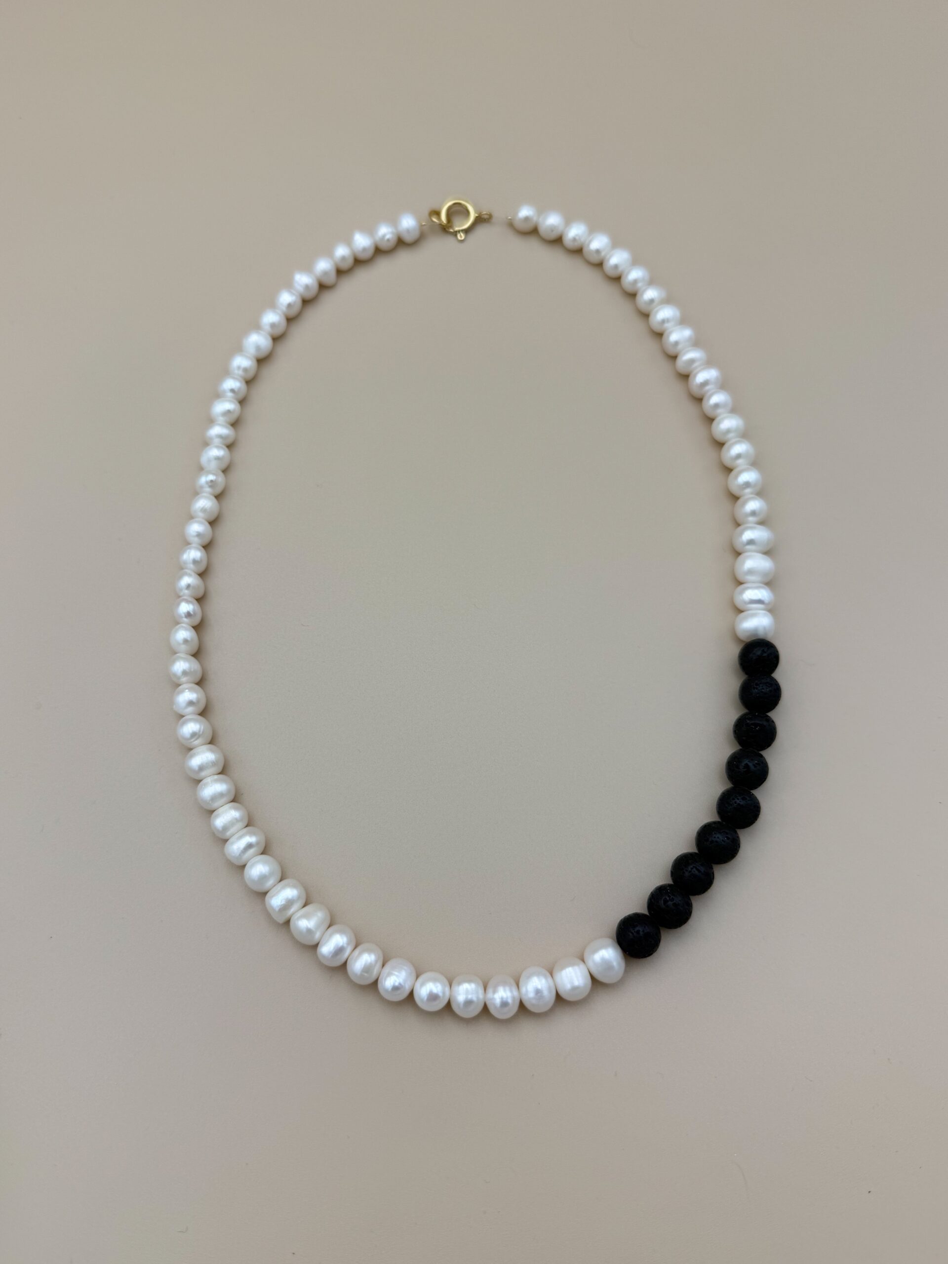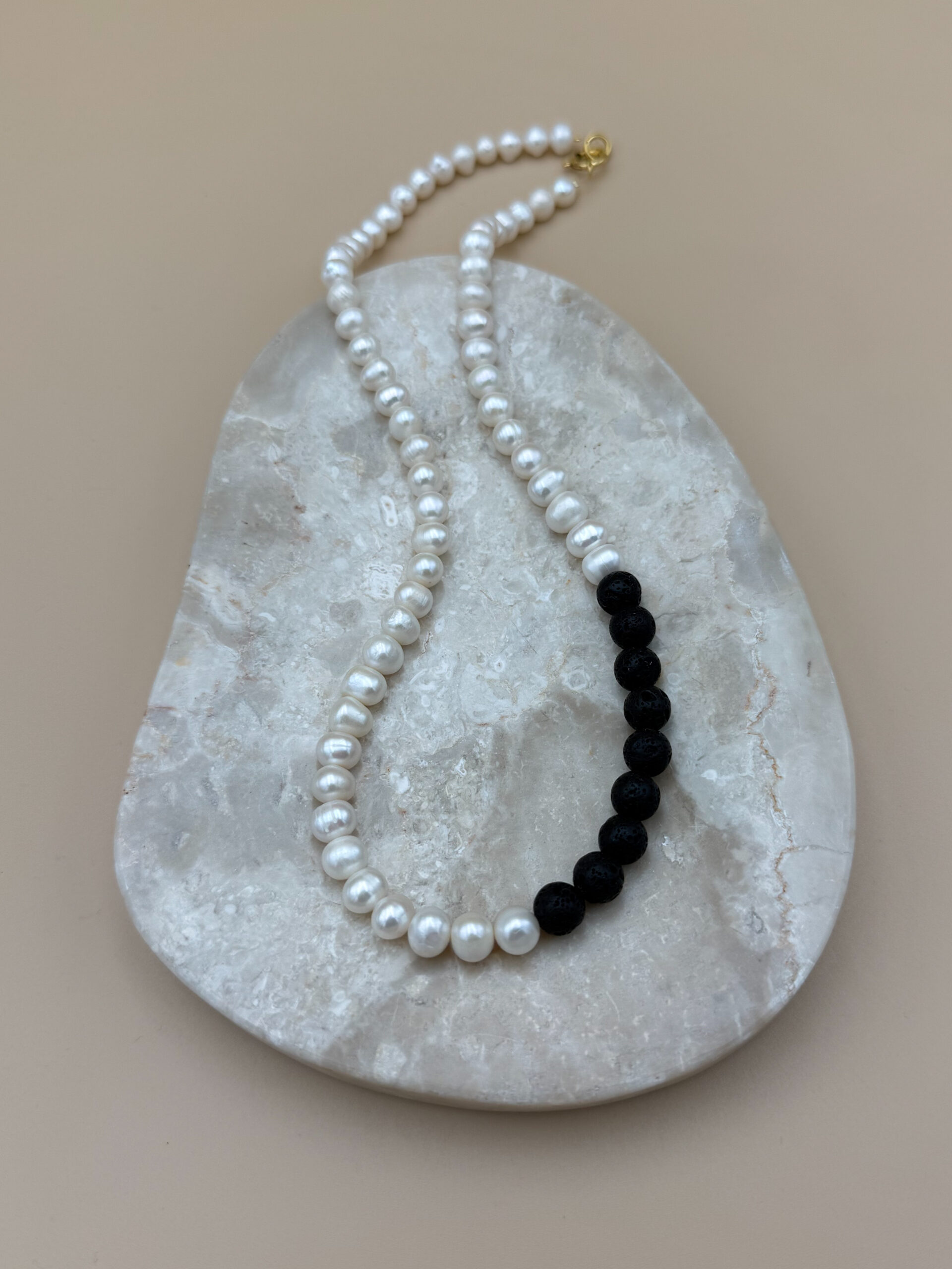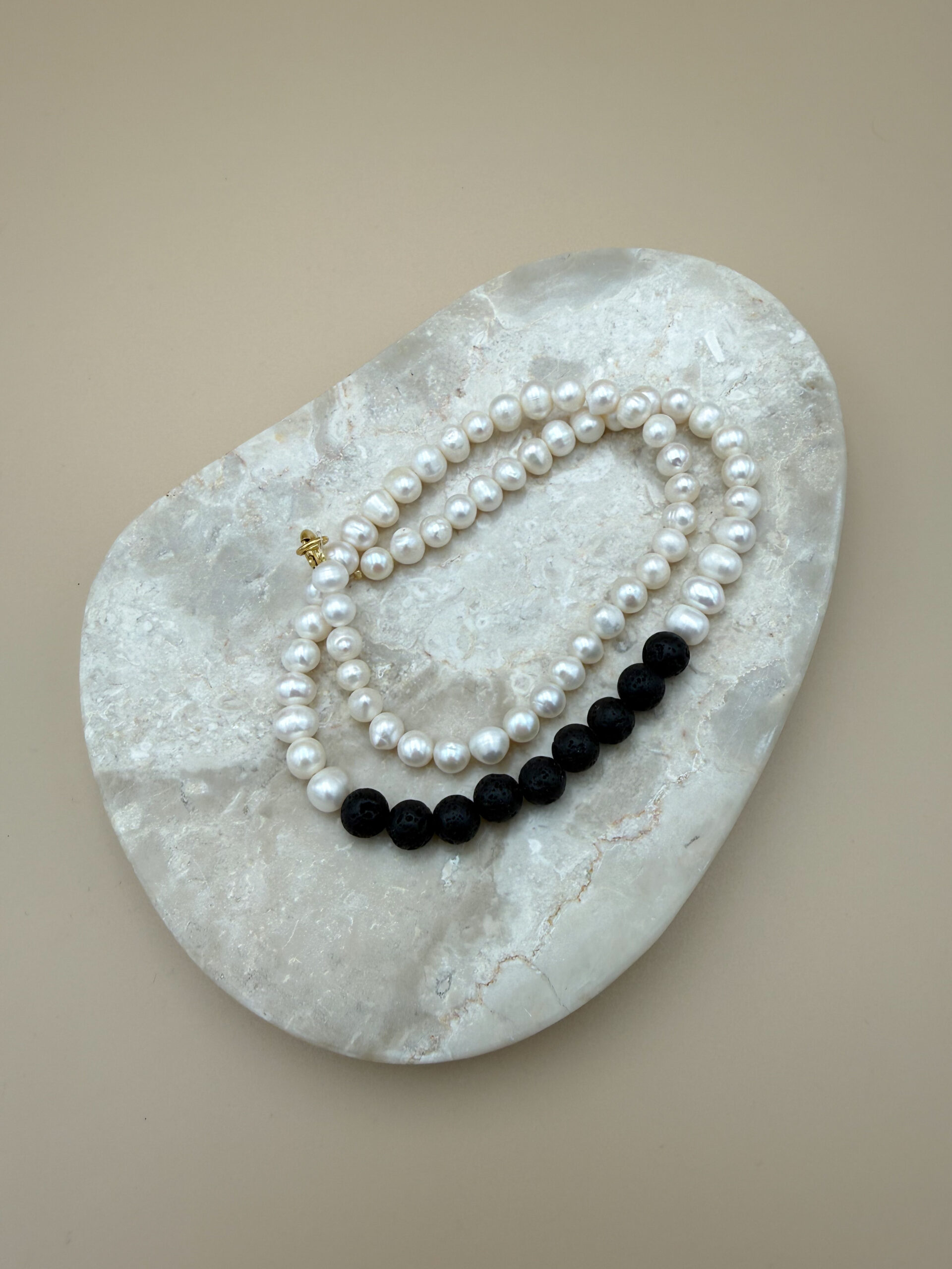Perły słodkowodne 8-9 mm, lawa wulkaniczna, masywne srebrne zapięcie pokryte 24-karatowym złotem.