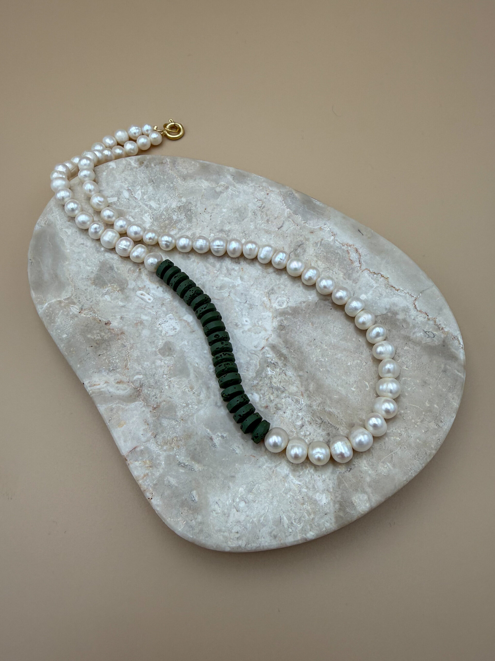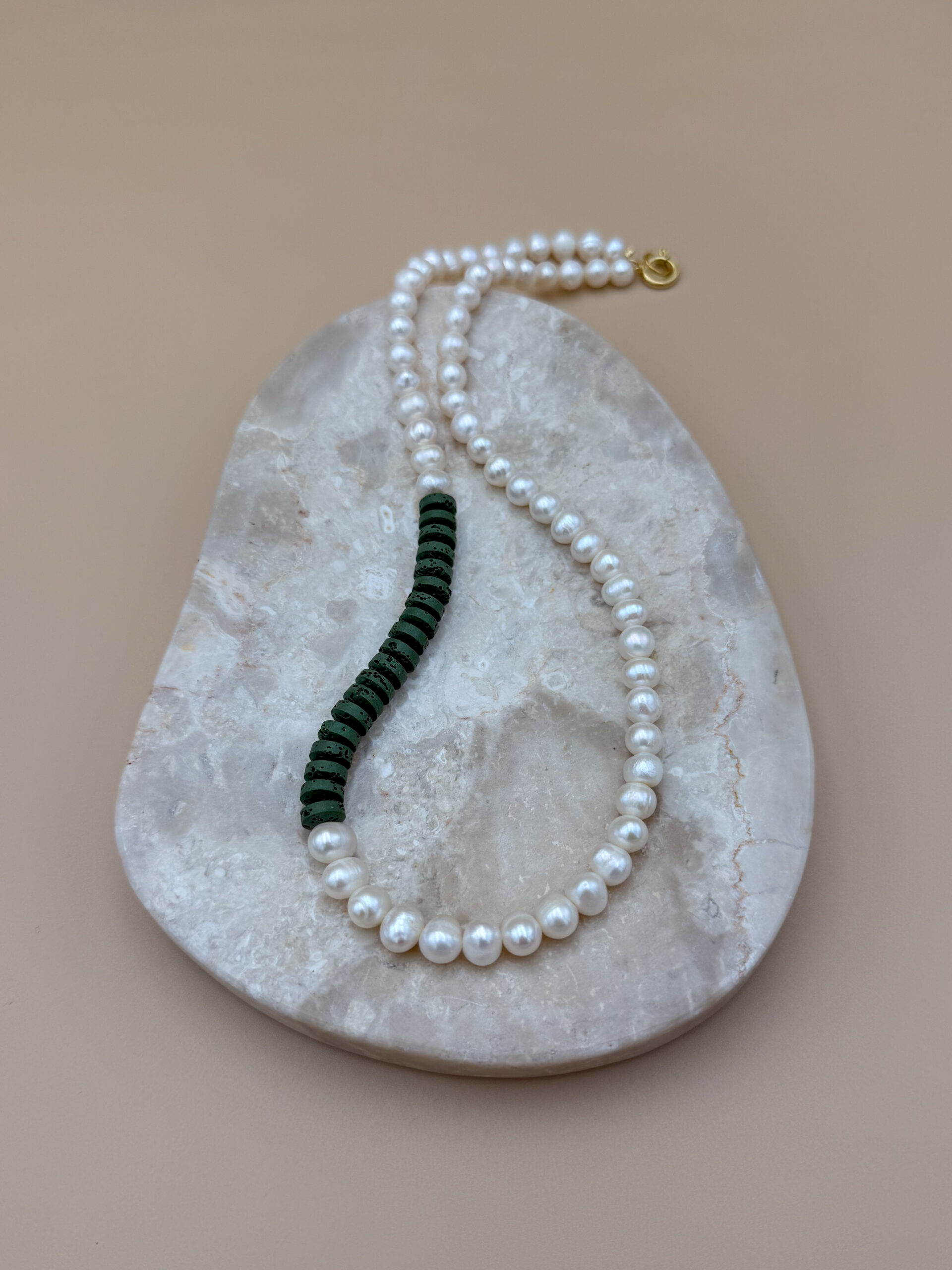 Perły słodkowodne 8-9 mm, lawa wulkaniczna, masywne srebrne zapięcie pokryte 24-karatowym złotem.